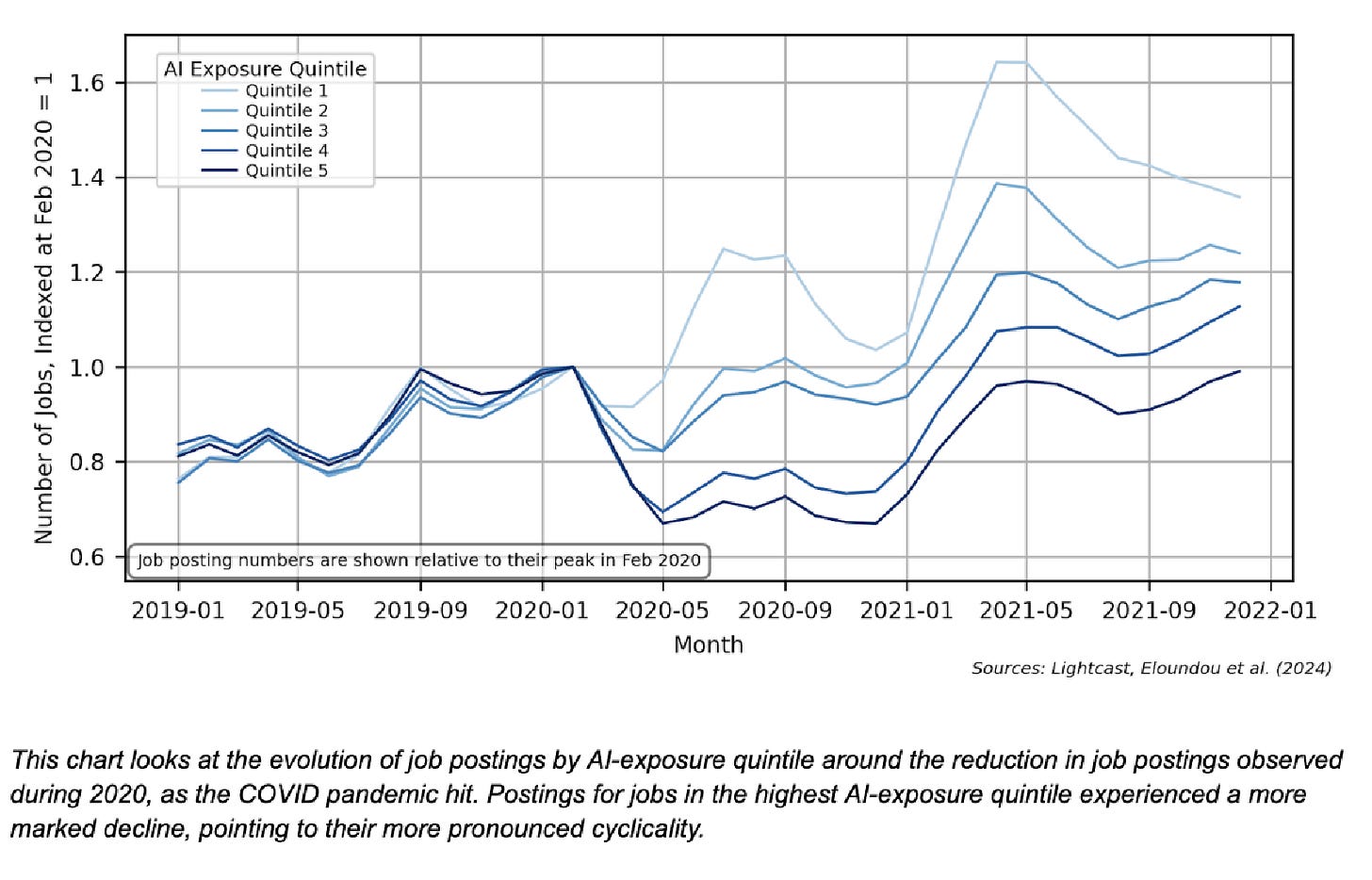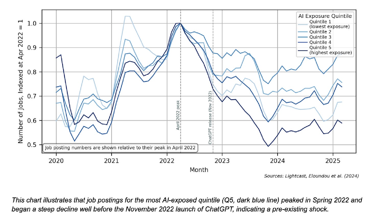 Chart 1 in the paper tracks job postings by AI exposure quintile, and it reveals that postings for the most AI-exposed occupations peaked in Spring 2022, then declined sharply throughout the rest of the year. By the time ChatGPT launched in November, the decline was already six months old.