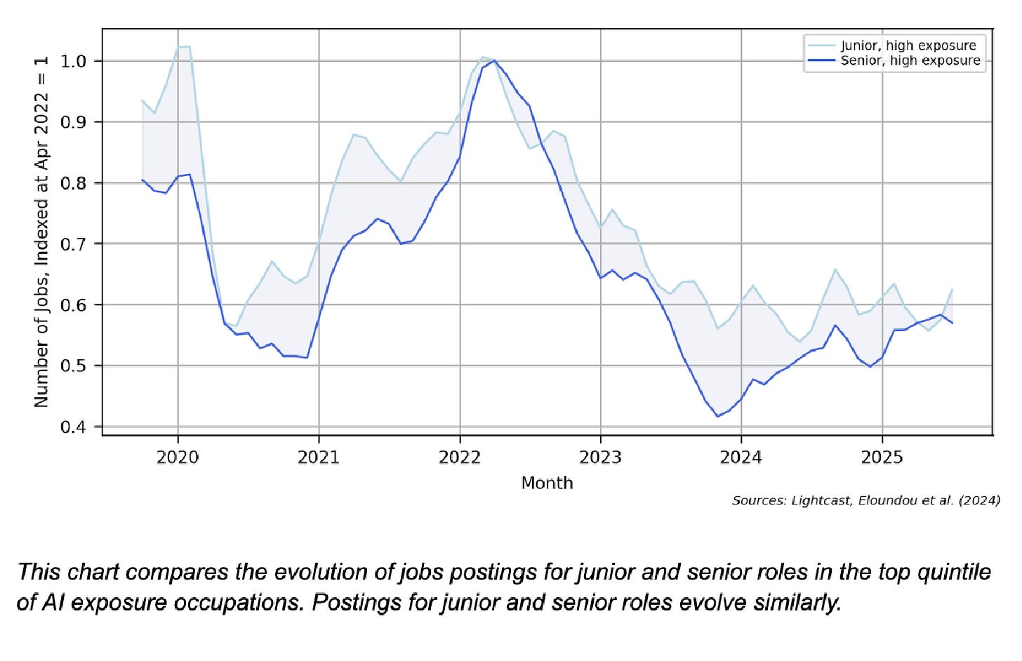 First, have you seen the paper by Hosseini and Lichtinger (2025)? They use LinkedIn résumé and job posting data from the US and actually do find differential effects between junior and senior positions - that might be worth considering alongside the other findings.